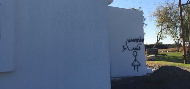 بصورة غير حضارية، تمت كتابة «مصلى النساء» وبجوارها رسمة على جدار الجزء المخصص للنساء في مسجد الاستراحة على طريق (الهير ــ العين)، وكان ينبغي وضع لافتة بدلاً من هذا الشكل الذي يشوّه المنظر العام للمكان، لذا أناشد المسؤولين في مدينة العين النظر في هذا الأمر.