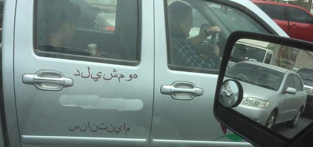 تسير هذه المركبة في أحد الطرق في دبي ومدوّن على أحد أبوابها حروف تعبر عن كلمات غير مفهومة، دون أي رقابة من الجهات المعنية، إذ ينبغي عدم منحها تصريح مزاولة أي نشاط تجاري أو ترخيصها قبل حذف أو تعديل هذه الكلمات، لذا أتمنى أن يتم مراقبة ومتابعة ما يكتب على المركبات قبل ترخيصها.