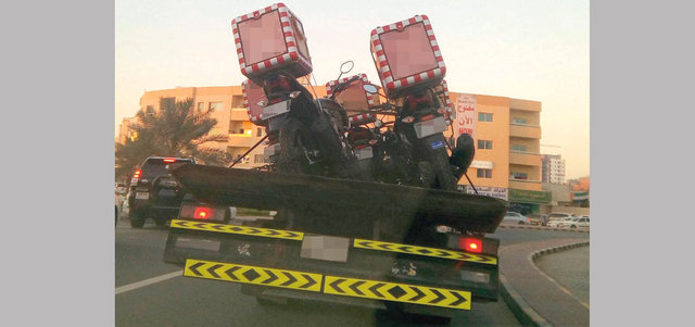 تبادر بعض مركبات القطر إلى وضع حمولة عشوائية، تشكل خطراً على مستخدمي الطريق في حال وقوعها، ما يؤكد تدني مستوى الوعي والثقافة المرورية لدى كثير من سائقي هذا النوع من المركبات. وفي الصورة سيارة تحمل دراجات نارية على نحو يشكل خطراً في حال وقوعها أثناء دوران المركبة.