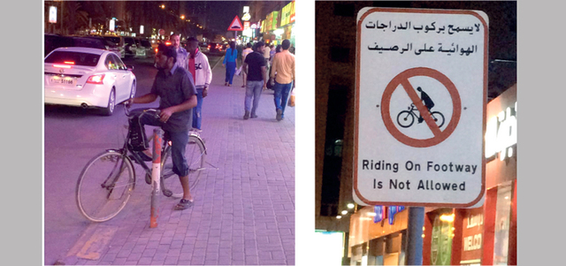يعمد بعض أصحاب الدراجات الهوائية إلى استخدام رصيف شارع الوحدة في الشارقة، رغم وجود لافتات تمنع سيرها على الرصيف، ما يسبب إزعاجاً للمارة، فضلاً عن أنهم قد يقطعون الطريق فجأة، ما يشكل خطورة على حياتهم وعلى الآخرين، لذا أناشد الجهات المعنية في الشارقة النظر في هذا الأمر.