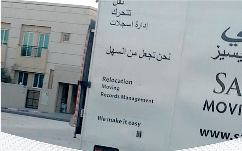 كتبت شركة تجارية على مركباتها عبارة «نحن تجعل من السهل»، و«نقل تتحرك إدارة اسجلات»، وهي ترجمة حرفية للّافتة الإنجليزية لشعار الشركة الذي يعني «نحن نجعل الأمر سهلاً»، أو «نقل الأثاث إدارة السجلات»، لكن بسبب الترجمة الخاطئة فقدت العبارة معناها، وأصبحت مشوهة، وكانت النتيجة عبارة عربية غير مفهومة، لذا نأمل من الجهات المعنية ضرورة التفتيش على اللافتات وشعارات الشركات، والعمل على تصحيح الأخطاء، من أجل حماية اللغة العربية من التشويه غير المقصود.