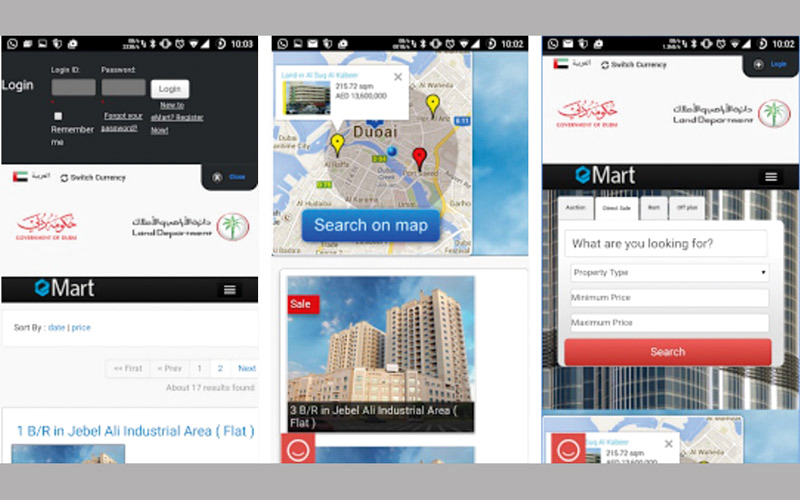 يوفر التطبيق الذكي «إي مارت»، التابع لدائرة الأراضي والأملاك في دبي، منصة عقارية إلكترونية متكاملة، تعمل على الهواتف والأجهزة المتحركة الذكية.