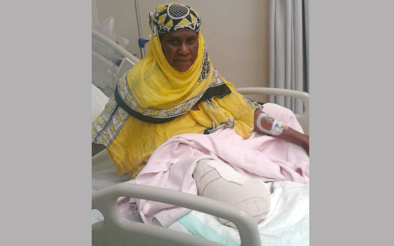 وأضافت «بعد تنظيف الجرح وأخذ المسكنات ظننت أن الأمر سينتهي، لكن النزيف تواصل على مدار ثلاثة أيام، وبات هناك تيبس في الأصابع، وشعرت بآلام مستمرة وحرقان، وتم نقلي مرة أخرى إلى مستشفى البراحة في دبي، حيث أجريت لي فحوص شملت تحاليل وأشعة مقطعية على القدم، وأخبرني الطبيب المعالج أنني أحتاج إلى تنظيم معدل السكر في الدم، إضافة إلى خمسة أكياس من الدم لرفع معدله، ثم إجراء عملية جراحية لبتر الساق حتى منطقة الركبة، وإبقائي في المستشفى لتلقي العلاج ما يقارب 30 يوماً». وتابعت: «كنت متخوفةً ومترددةً في إجراء العملية، لكن بعد تفكير في ما قاله الطبيب من أنه لا سبيل سوى بتر الساق حتى لا يتلوث الدم بالكامل، وتصير حياتي مهددة بالخطر، ولأنه لم يكن لدي حل آخر، وحالتي الصحية تتدهور يوماً بعد يوم، وافقت على إجراء العملية حتى لا أخسر حياتي، ويصبح أبنائي الثلاثة (هيثم ـ 25 عاماً) و(هناء ـ 23 عاماً) و(كرم ـ 20 عاماً) بلا معيل، فتم عمل فحوص جديدة لمعرفة الوضع الصحي، وتبين أن نسبة السكر انتظمت ووصلت إلى المعدل الطبيعي، وبعد إجراء الجراحة مكثت في المستشفى 14 يوماً أتلقى العلاج اللازم من تنظيف يومي لموضع الجرح، وإزالة الطبقة المتكونة عليه، لمنع حدوث العدوى وتجنب وقوع التهابات، وبعدها عدت إلى المنزل».