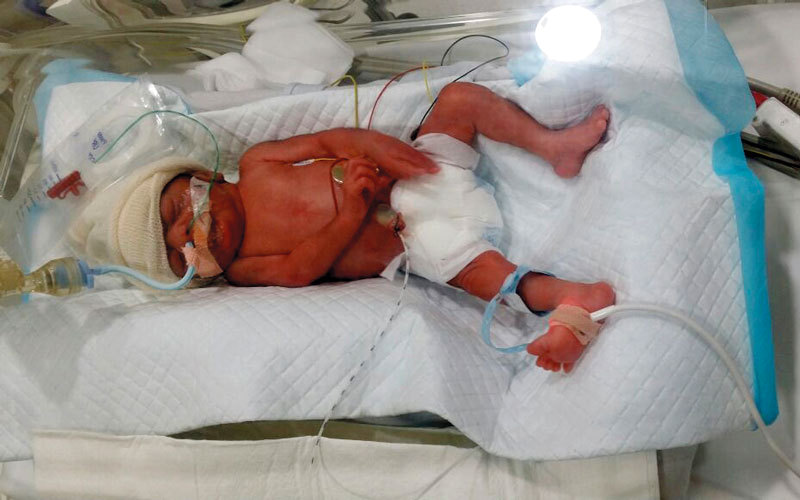 وأوضح التقرير أن «الطفلة ولدت خفيفة الوزن (600 غرام)، قبل أن يكتمل نمو رئتيها، ما استدعى مكوثها في قسم العناية المركزة، وتكثيف العلاج لها، ومتابعتها بصورة مستمرة، وإجراء علاج طبيعي مكثف لها حتى تتحسن حالتها الصحية»، لافتاً إلى أنها لاتزال تحت الملاحظة والمتابعة المستمرة من الأطباء، للتأكد من تجاوزها مرحلة الخطر وتحسن وضعها.
