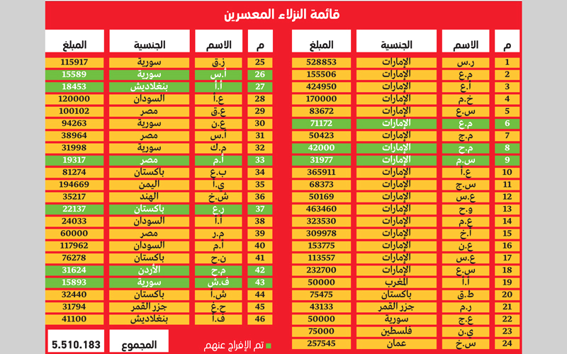 فيما لايزال 37 سجيناً ينتظرون مد يد العون لهم، وتبلغ قيمة مديونياتهم خمسة ملايين و510 آلاف و183 درهماً.