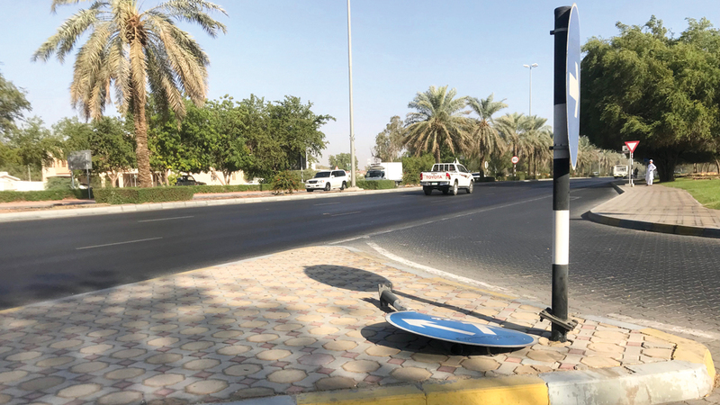 لافتة في منطقة الخريس بالعين، وتحديداً قبل محطة بترول أدنوك باتجاه منطقة القطارة، تعرضت لحادث ما أدى إلى سقوطها أرضاً. المشكلة أن وجودها على هذا النحو قد يُغري بعض العابثين باستخدامها في تغيير وجهة الطريق.