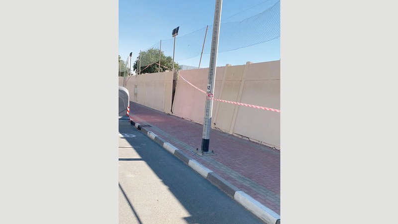 يوشك أحد جدران نادي الإمارات العلمي (مدرسة المعهد الديني سابقاً) في منطقة الممزر في دبي على السقوط أرضاً، بسبب وجود تصدع كبير فيه، ما يشكل خطراً كبيراً على الموجودين قربه.