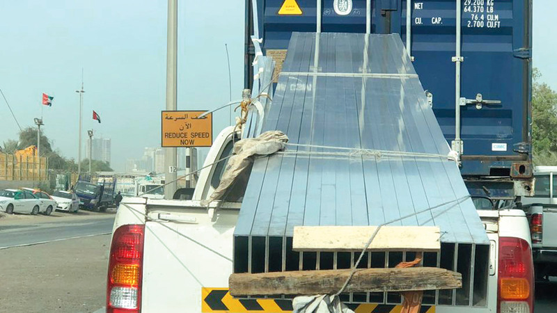 مركبة تنقل حمولة مكونة من أنابيب أسطوانية بطريقة غير آمنة، بسبب عدم تجهيزها لنقل هذا النوع من المواد، ما يشكل خطراً كبيراً على مستخدمي الطريق الآخرين في حال وقوعها على الطريق.