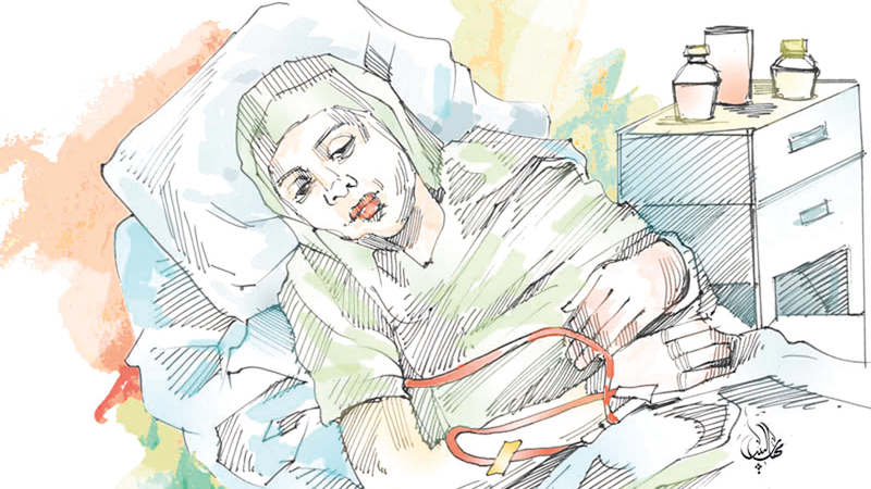 والمشكلة أن إمكانات زوجها المالية وظروفه الصحية لا تسمحان له بتدبير المبلغ المطلوب لمواصلة علاجها.