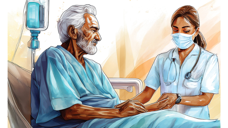 يصارع (أبوشما - هندي - 65 عاماً) مرض سرطان الرئة منذ تسعة أشهر تقريباً، حيث بدأت معاناته بضيق شديد في التنفس، وسعال مستمر. وعندما ساءت حالته الصحية، توجه إلى قسم الطوارئ في مستشفى مدينة الشيخ شخبوط الطبية، ومنه إلى قسم العناية المركزة، للسيطرة على وضعه الصحي الحرج.