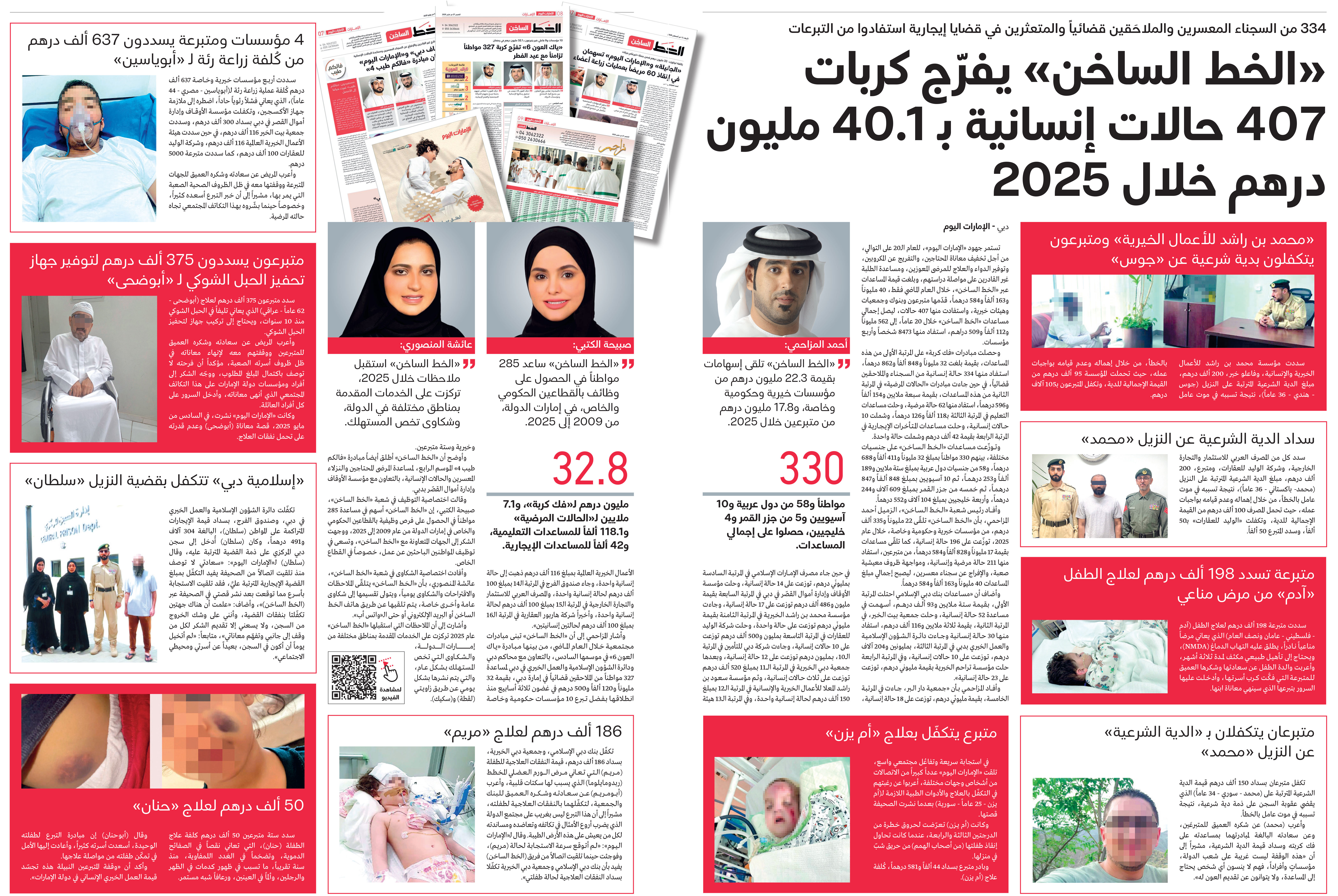 وأفاد رئيس شعبة «الخط الساخن»، الزميل أحمد المزاحمي، بأن «الخط الساخن» تلقّى 22 مليوناً و335 ألف درهم، من مؤسسات خيرية وحكومية وخاصة، خلال عام 2025، توزّعت على 196 حالة إنسانية، كما تلقّى مساعدات بقيمة 17 مليوناً و828 ألفاً و584 درهماً، من متبرعين، استفاد منها 211 حالة مرضية وإنسانية، ومواجهة ظروف معيشية صعبة، والإفراج عن سجناء معسرين، ليصبح إجمالي مبلغ المساعدات 40 مليوناً و163 ألفاً و584 درهماً.
