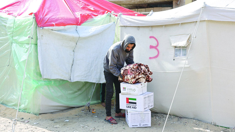 وأطلقت الدولة حملة «تراحم من أجل غزة»، لإغاثة الأشقاء الفلسطينيين المتأثرين من الحرب في قطاع غزة، وأرسلت مساعدات طبية وإغاثية عاجلة، وأطلقت عملية «الفارس الشهم 3» الإنسانية، في الخامس من نوفمبر الماضي، لتقديم الدعم الإنساني إلى الشعب الفلسطيني الشقيق في غزة، تجسيداً لقيم التضامن والتآزر معه، والتي تضمنت إقامة مستشفى ميداني متكامل داخل قطاع غزة، وإقامة ست محطات تحلية مياه بطاقة إجمالية تبلغ مليوناً و200 ألف غالون يومياً، يجري ضخها إلى القطاع، ويستفيد منها أكثر من 600 ألف نسمة. وأطلقت هيئة الهلال الأحمر الإماراتي، ضمن «عملية الفارس الشهم 3»، قافلة مساعدات إنسانية لسكان قطاع غزة، ضمن حملتها الشتوية السنوية «أنتم الأيادي الدافئة»، حيث تتضمن نحو مليون و650 ألف قطعة من الملابس الشتوية والأغطية للتدفئة، لمواجهة البرد القارس. وتواصل دولة الإمارات من خلال مؤسساتها الإنسانية والخيرية تقديم مختلف أشكال الدعم للشعب الفلسطيني الشقيق.