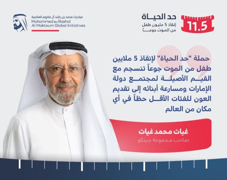انضم رجل الأعمال الإماراتي غياث محمد غياث صاحب مجموعة جينكو، إلى قائمة المساهمين في حملة "حد الحياة" لإنقاذ 5 ملايين طفل من الموت جوعاً، التي أطلقها صاحب السمو الشيخ محمد بن راشد آل مكتوم نائب رئيس الدولة رئيس مجلس الوزراء حاكم دبي "رعاه الله" ، بالتزامن مع شهر رمضان الكريم، لجمع مليار درهم على الأقل يتم استثمارها في تنفيذ برامج ومشاريع مستدامة تسهم في مكافحة جوع الأطفال في العالم، حيث أعلن عن تقديم 8 ملايين درهم دعماً للحملة.