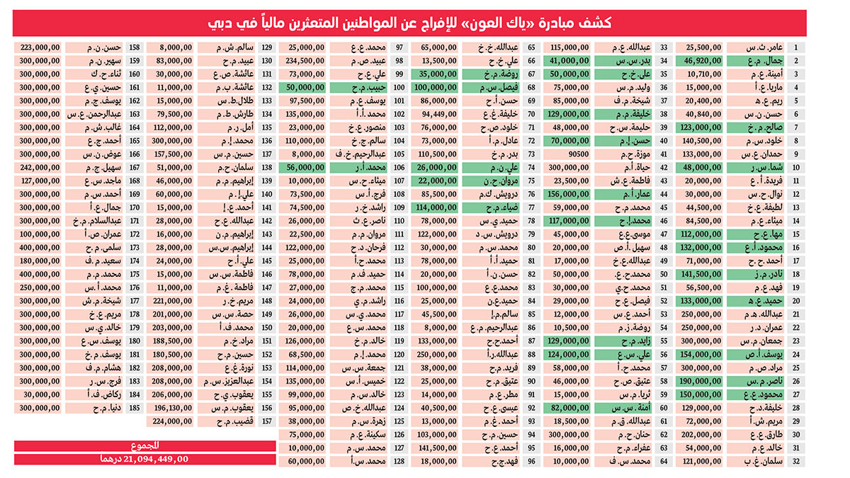 وأسهمت «ياك العون» خلال المواسم السابقة في الإفراج عن 875 مواطناً من المتعثرين مالياً والملاحقين قضائياً في دبي، بمبلغ 116 مليوناً و984 ألفاً و16 درهماً.