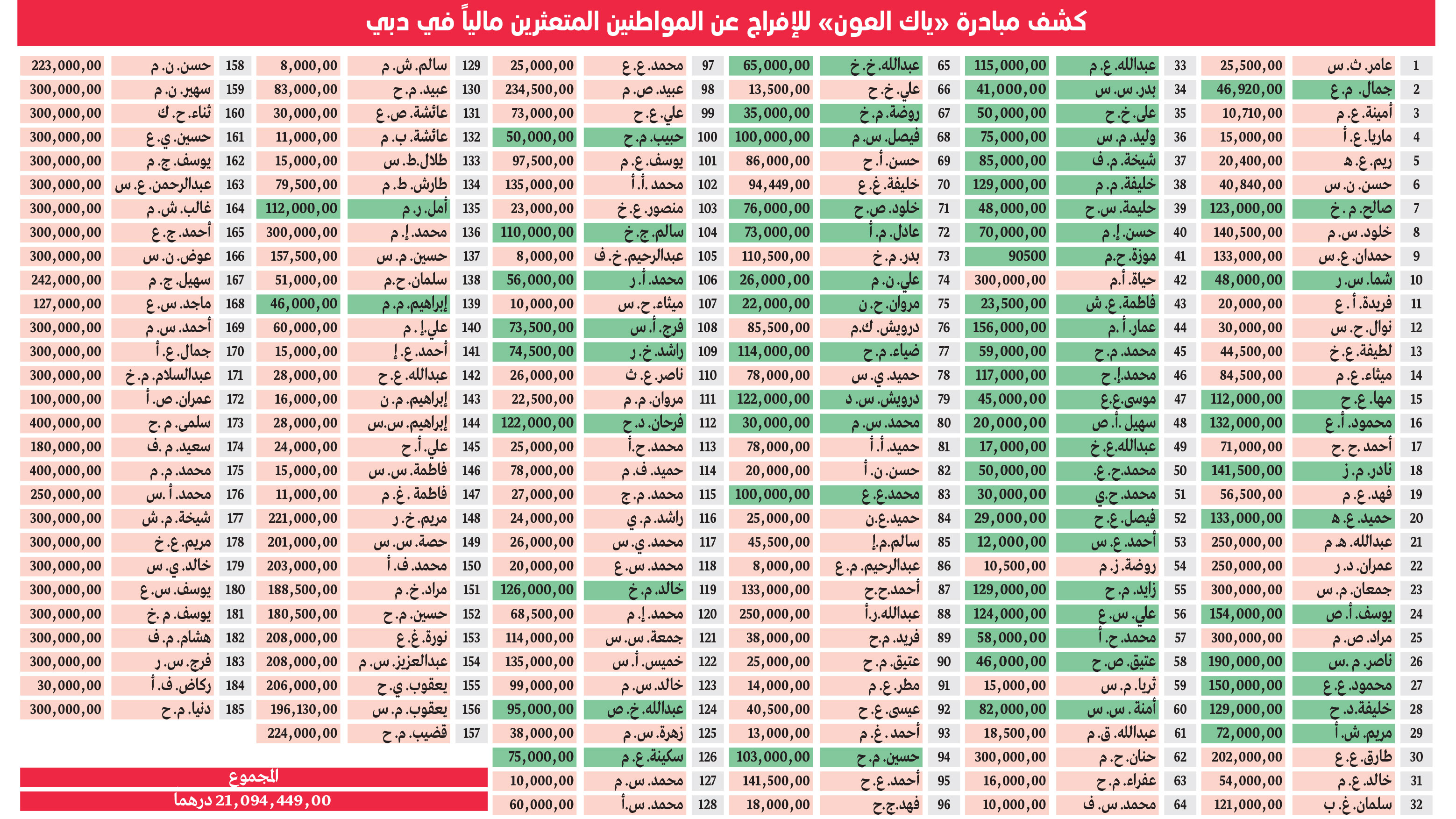 وتستهدف المبادرة، التي تتبناها «الإمارات اليوم» ومحاكم دبي ودائرة الشؤون الإسلامية والعمل الخيري في دبي، الإفراج عن 185 مواطناً في دبي من المتعثرين مالياً والمُلاحَقين قضائياً، ومترتبة عليهم قضايا مالية، من خلال سداد مديونياتهم، البالغة 21 مليوناً و94 ألفاً و449 درهماً، للمّ شملهم بأسرهم قبل حلول عيد الفطر المبارك.