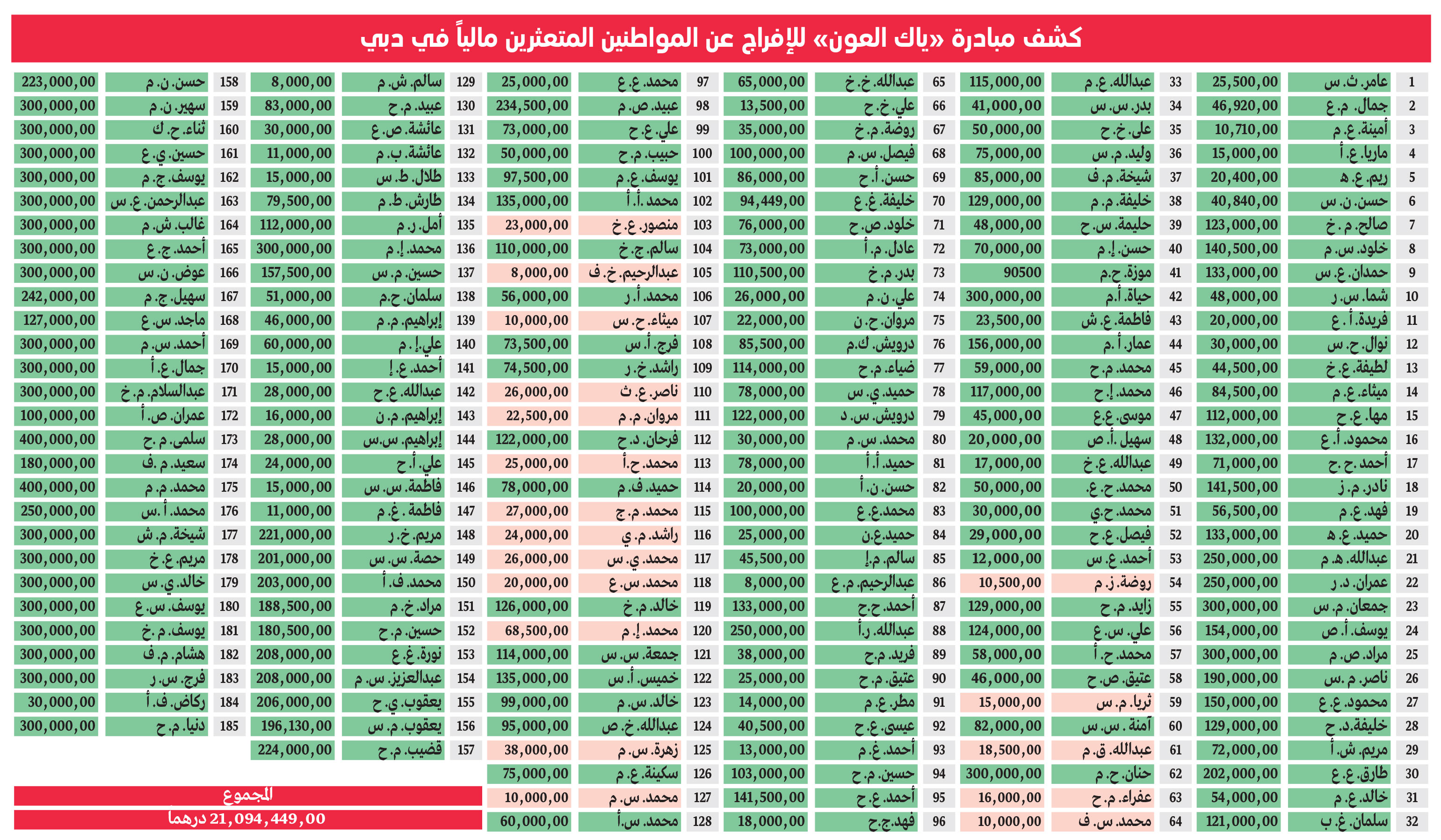 وتسعى المبادرة - التي تتبناها «الإمارات اليوم» ومحاكم دبي ودائرة الشؤون الإسلامية والعمل الخيري في دبي - إلى الإفراج عن 185 مواطناً في دبي من المتعثّرين مالياً والملاحَقين قضائياً، ومترتبة عليهم قضايا مالية، من خلال سداد مديونياتهم البالغة 21 مليوناً و94 ألفاً و449 درهماً، لجمع شملهم بأسرهم قبل عيد الفطر المبارك.