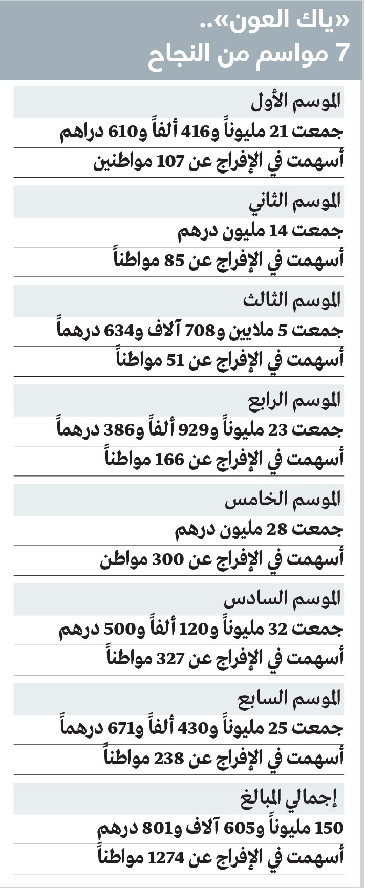 حققت مبادرة «ياك العون» ملحمة مجتمعية وطنية في موسمها السابع، ونجحت في تحقيق المستهدف وتجاوزته بأربعة ملايين و336 ألفاً و222 درهماً في غضون أربعة أسابيع من انطلاقها، بفضل إسهامات 11 مؤسسة حكومية وخاصة، و10 متبرعين من أفراد المجتمع.