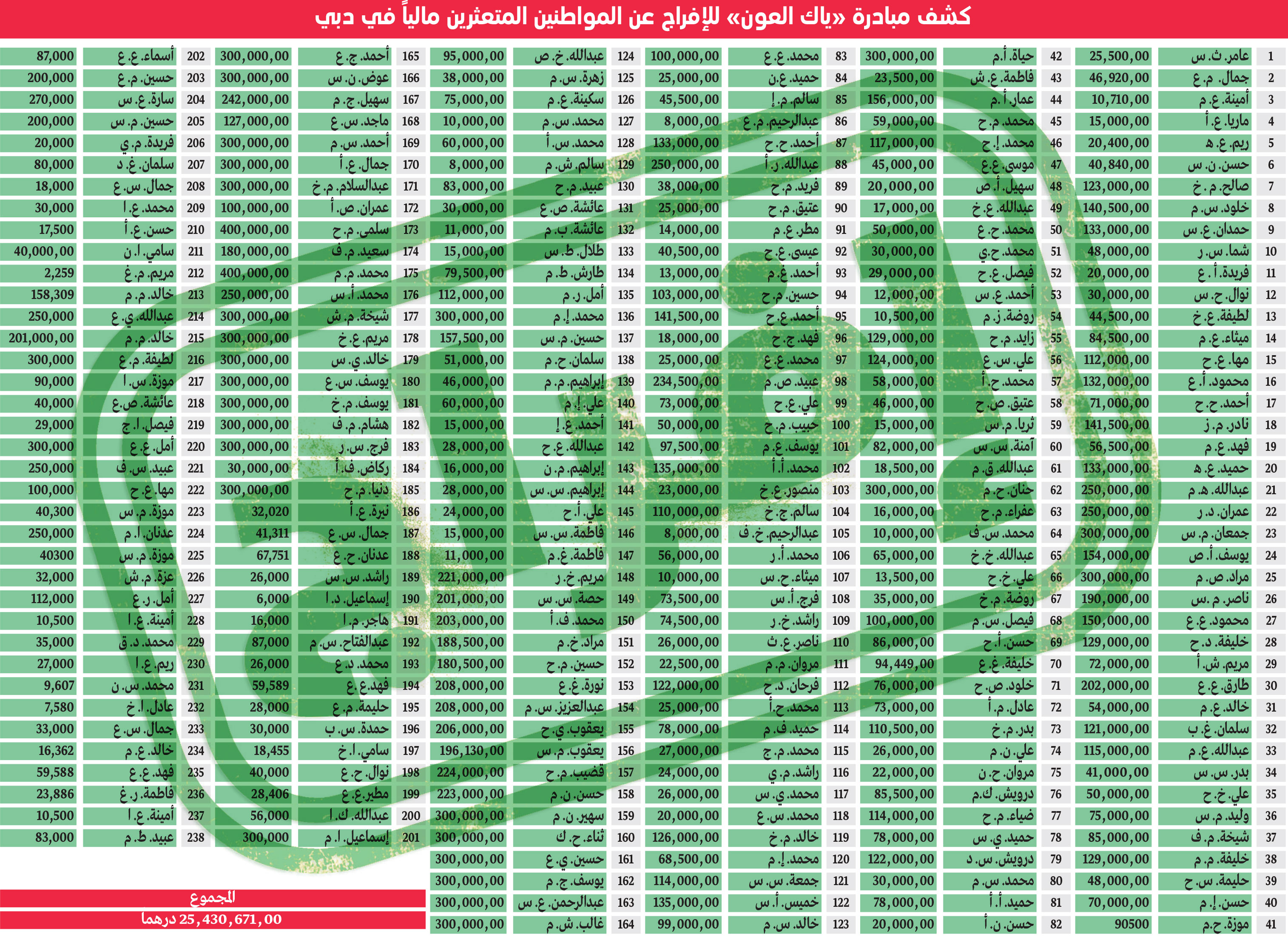 وأشار إلى أنه نظراً للإقبال الكبير من المتبرعين والجهات الحكومية والخاصة والمؤسسات الخيرية الراغبين في المساهمة بالمبادرة، قررت «الإمارات اليوم» بالتعاون مع محاكم دبي ودائرة الشؤون الإسلامية والعمل الخيري في دبي، زيادة عدد المشمولين بالمبادرة من 185 إلى 238 مواطناً، كما تم رفع المبلغ المستهدف من 21 مليوناً و94 ألفاً و449 درهماً إلى 25 مليوناً و430 ألفاً و671 درهماً.