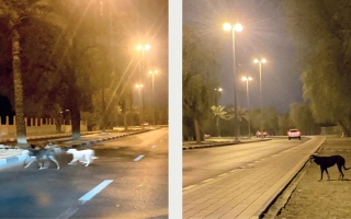 كلاب ضالة رصد سكان بمنطقتَي الطوية والنايفة في العين كلاباً ضالة تجوب الشوارع، خصوصاً في الفترة المسائية.. وهنا بعضها يتجول في «
