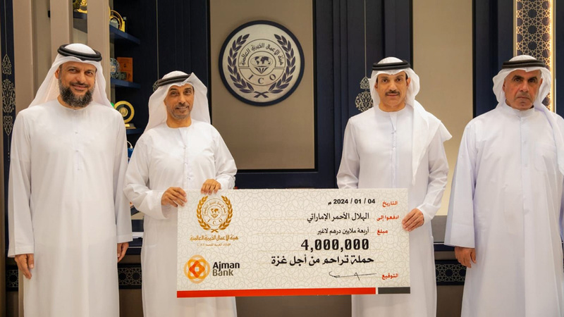 سلم الشيخ محمد بن عبدالله النعيمي، رئيس مجلس أمناء هيئة الأعمال الخيرية العالمية، شيكاً بمبلغ أربعة ملايين درهم، إلى مدير مركز الهلال الأحمر في إمارة عجمان، محمد عمر الشمري، دعماً لحملة «تراحم من أجل غزة» التي تم إطلاقها، بهدف مساعدة الأشقاء في فلسطين.
