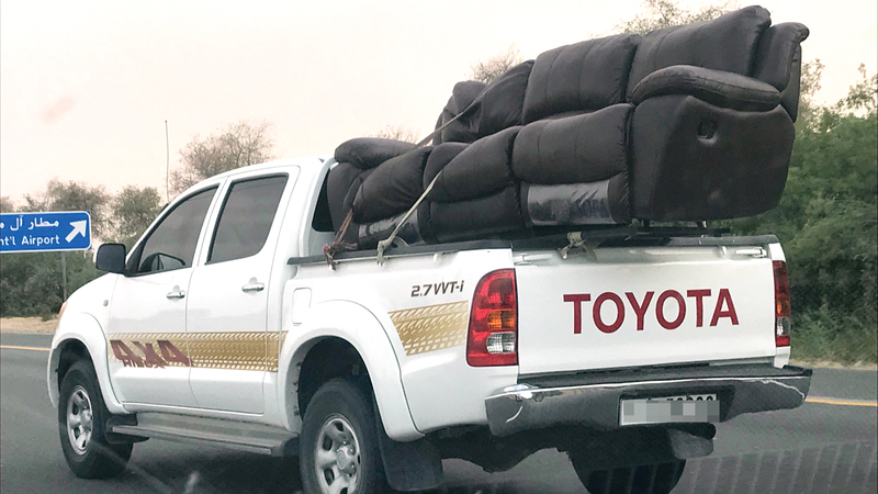 نطالب الجهات المعنية في الدولة بتغليظ المخالفة المرورية على مركبات تقوم بنقل حمولة بطريقة خطرة، وتشكل تهديداً على سلامة مرتادي الطريق، ففي الصورة نرى شاحنة صغيرة تسير في إحدى طرق العين وهي تنقل أثاثاً يكاد يسقط على الطريق في إشارة إلى قلة وعي السائق.