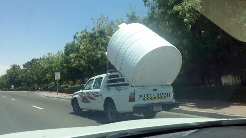 مركبة تحمل برميلاً ضخماً، ويسير سائقها على أحد الطرقات في مدينة العين، متجاهلاً ما يشكله سلوكه من خطر على مستخدمي الطريق الآخرين، خصوصاً في حال عبوره أحد الدوارات، أو استخدامه أحد المنعطفات.