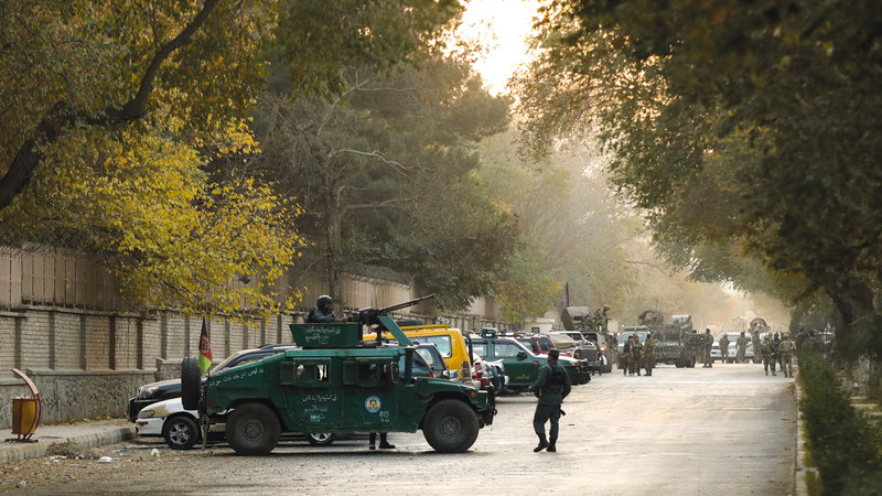 قوات أمنية أفغانية بالقرب من موقع الهجوم على الجامعة. إي.بي.إيه
