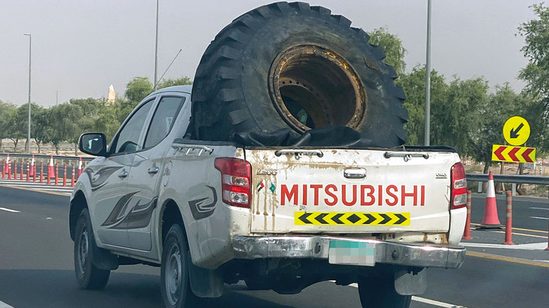 يتعمد بعض السائقين وضع حمولات مخالفة على مركباتهم، مثلما تبين الصورة مركبة على أحد طرق دبي، ووضع سائقها إطاراً ضخماً بطريقة مخالفة.