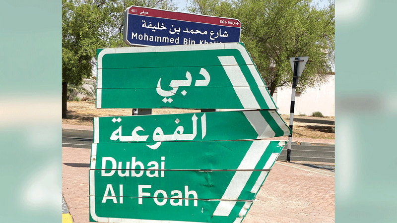 لافتة في شارع محمد بن خليفة بمنطقة هيلي، ماثلة في موقعها بعد تعرضها لأضرار جعلتها تبدو متآكلة، أو موشكة على الاهتراء كلياً، على الرغم من مرور نحو شهرين على تضررها.