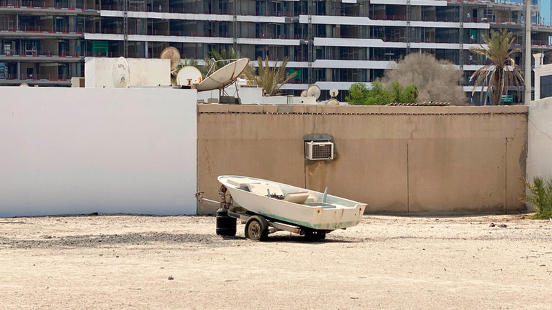 وفي الصورة قارب متروك بساحة رملية في منطقة جميرا، يشوه المنظر العام للمكان.