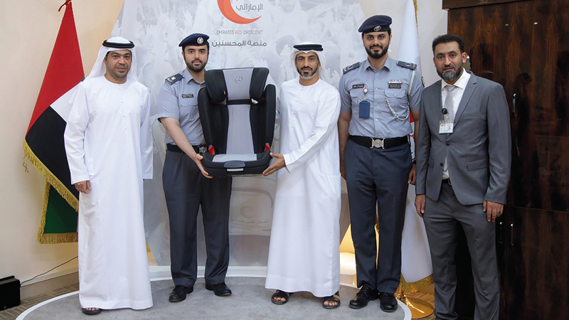شرطة أبوظبي و«الهلال الأحمر» توزعان مقاعد الأطفال. من المصدر