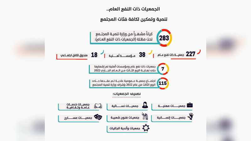 أفادت وزارة تنمية المجتمع بأن عدد الجمعيات والمؤسسات الأهلية ذات النفع العام وصناديق التكافل الاجتماعي المشهرة من قبلها على مستوى الدولة، بلغ 283 حتى نهاية الربع الثالث من العام الجاري، وتضمّنت 227 جمعية ذات نفع عام، و38 مؤسسة أهلية، و18 صندوق تكافل اجتماعي.