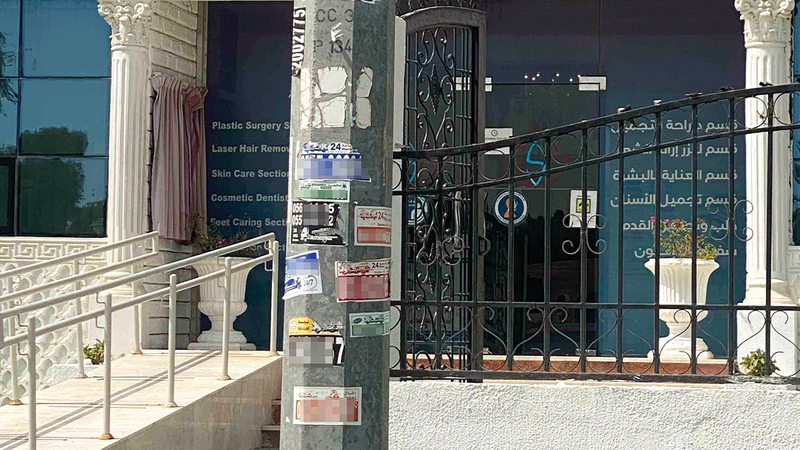 إعلانات عشوائية تغلف أعمدة الإنارة واللافتات الإرشادية في المواقف العامة وعلى الطرقات الرئيسة، وتتضمن ملصقات تقترح أرقام هواتف لخدمات محددة، مثل قطر السيارات والإعلان عن توافر وحدات سكنية للإيجار.