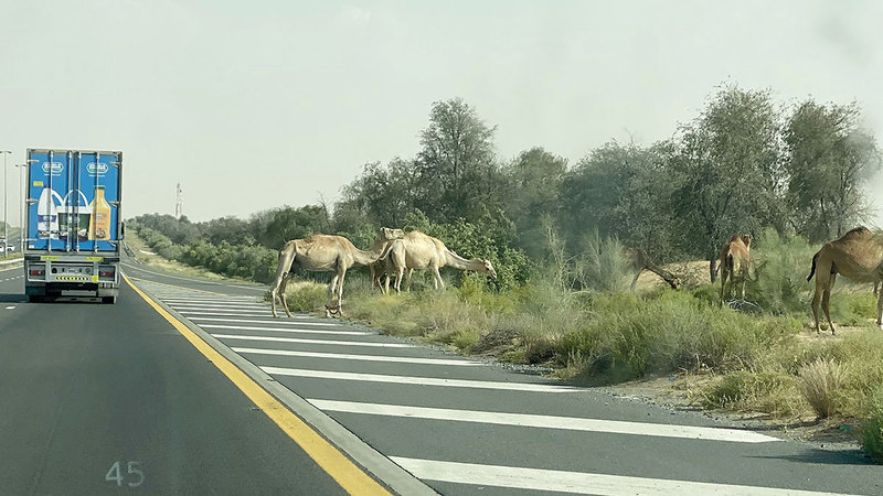 نستغرب نحن السائقين على طريق دبي - العين، وجود جمال سائبة ترعى على أكتاف الطريق لأنها تشكل إرباكاً للسائقين.