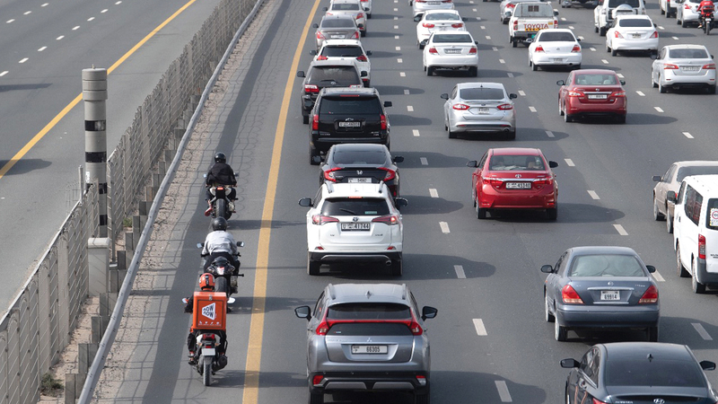 ثلاثة من سائقي الدراجات النارية يسيرون على «كتف الطريق» بسرعات عالية، على الرغم من أن القانون يمنع سير الدراجات والمركبات في هذا الجانب من الطريق.
