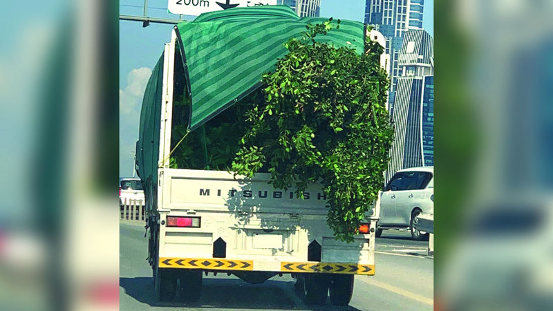 يحمل سائق الشاحنة أغصان أشجار دون أن يغطي الجزء الخلفي.. تاركاً الأغصان والأوراق تتطاير على الطريق، ما يسبب إزعاجاً للسائقين.