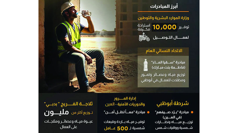 وكانت وزارة الموارد البشرية والتوطين أعلنت توفير أكثر من 10 آلاف استراحة مُكيّفة، ومزودة بوسائل الراحة، لاستخدامها من قبل عمال خدمات التوصيل، في جميع مناطق الدولة، خلال فترة تطبيق «حظر العمل وقت الظهيرة»، الممتدة من 15 يونيو حتى 15 سبتمبر من كل عام، ويواصل الاتحاد النسائي العام تنفيذ مبادرة «سقيا الماء/ فاطمة بنت مبارك»، التي تمتد خلال أشهر الصيف، وتستهدف آلاف العمال في مختلف مناطق إمارة أبوظبي، وتتضمن توزيع المياه والعصائر والتمر، ومظلات واقية ووسائل حماية، لتخفيف أثر الحرارة خلال ساعات الذروة، ونفّذت شرطة أبوظبي مبادرة «برد صيفهم» للعمال في المواقع الإنشائية وتضمنت توزيع المياه والنظارات الشمسية وواقيات الشمس وبالتنسيق مع فرع الشؤون العمالية بمديرية شرطة منطقة العين، ووزعت النسخة الثانية من الحملة المجتمعية الإنسانية «ثلاجة الفريج»، التي تأتي بدعم من مؤسسة مبادرات محمد بن راشد آل مكتوم العالمية، أكثر من مليون عبوة من المياه والعصائر والمثلجات على العمال في دبي، خلال شهر واحد منذ انطلاقها في 23 يونيو الماضي، كما نفّذت إدارة المرور والدوريات الأمنية في منطقة العين التابعة لمديرية المرور والدوريات في شرطة أبوظبي مبادرة «معاً لظل آمن» استهدفت فيها 500 فرد من فئة العمال، وتضمنت توزيع عبوات مياه باردة وقبعات شمسية على العمال. ونظّم الهلال الأحمر الإماراتي - مركز عجمان، مبادرته الإنسانية «لنروي عطشهم»، بهدف توزيع المياه والعصائر الباردة على 600 عامل، وشاركت جمعية بيت الخير في حملة حظر العمل وقت الظهيرة التي أطلقتها وزارة الموارد البشرية والتوطين، وذلك عبر توزيع 550 وجبة غذائية مرفقة بالمياه المبردة والعصائر على العمال.