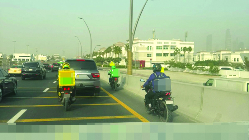 لاحظ قائدو مركبات دائمو التردد على شارع الوصل، سلوكاً متهوراً ينتهجه عدد من سائقي توصيل الطلبات خلال أوقات الذروة والازدحام المروري، يتمثّل في قيامهم بقيادة دراجاتهم النارية على كتف الطريق، مثلما يظهر في الصورة سائقان يسيران على كتف الطريق أعلى جسر الوصل، من دون مراعاة لما يمثله ذلك من مخالفة مرورية.