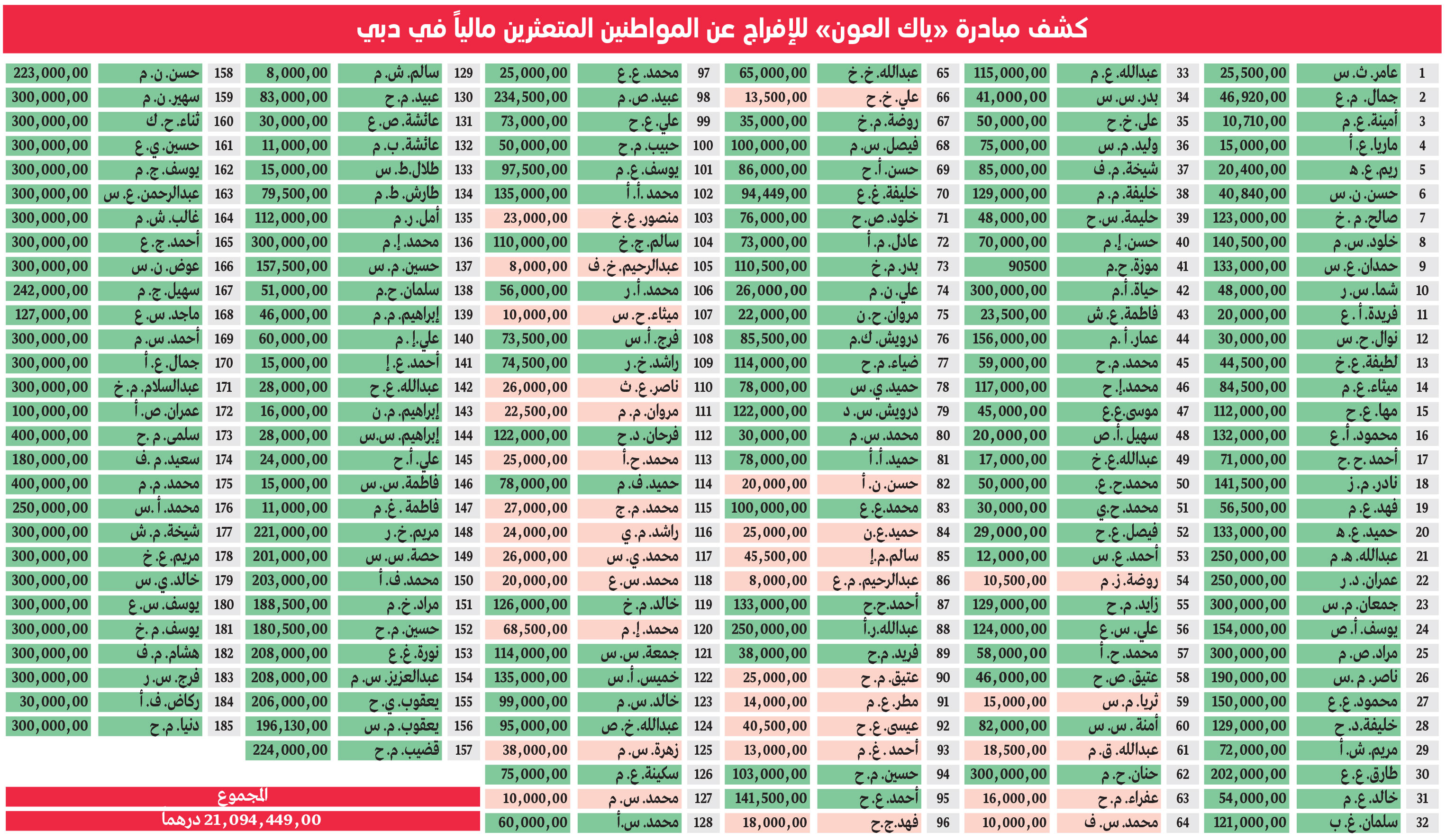 وأسهمت «ياك العون» خلال المواسم السابقة في الإفراج عن 875 مواطناً من المتعثّرين مالياً والملاحقين قضائياً في دبي، بمبلغ 116 مليوناً و984 ألفاً و16 درهماً.