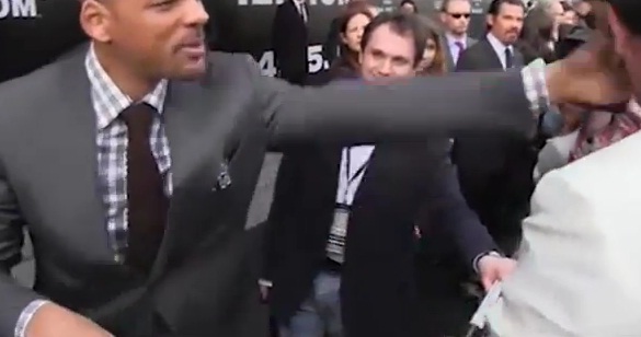 ونشر موقع "تي إم زد" المتخصص بأخبار المشاهير شريط فيديو، أمس، يظهر الصحافي وهو يحاول تقبيل الممثل ، فدفعه سميث بغضب وصفعه على وجهة بظهر يده.