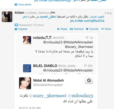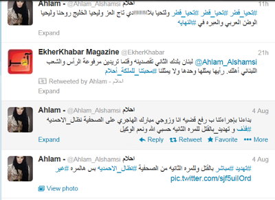 وقالت احلام عبر صفحتها بتويتر " بادئنا بإجراءتنا ب رفع قضية انا وزوجي مبارك الهاجري على الصحفية نضال الاحمد قذف وتهديد بالقتل للمره الثانية حسبي الله ونعم الوكيل".