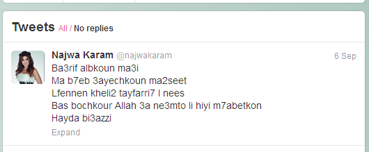 وقالت نجوى كرم في التغريدة "أعلم بأن قلوبكم معي، ولا أحب أن أعيشكم معي في مأساتي، الفنان خلق ليفرح الناس، ولكنني أشكر الله على نعمته وهي محبتكم، هذا ما يعزي".