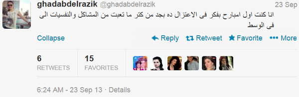 ونشرت غادة عبدالرازق، تغريدة عبر حسابها بتويتر قائلةً "فكرت في الاعتزال أول من أمس، من كتر ما تعبت من المشاكل والنفسيات في الوسط الفني".