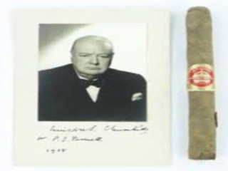 يعرض مزاد بريطاني سيجاراً، لرئيس الوزراء البريطاني الأسبق، ونستون تشيرتشل، للبيع إلى جانب صورة تحمل توقيعه.