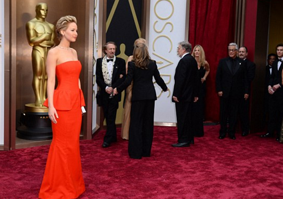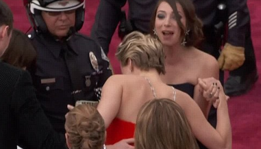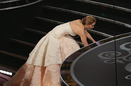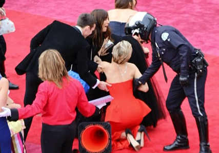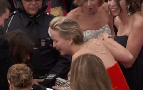 للسنة الثانية على التوالي، وفي حفل استلام جوائز الأوسكار، تعثرت الشابة الحائزة على جائزة أفضل ممثلة العام الماضي جينيفر لورنس (23 عاما) وهي تسير على السجادة الحمراء.