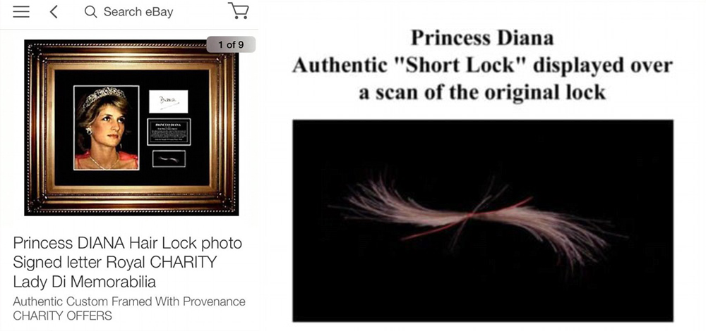 عرض بائع أميركي خصلة شعر تعود للأميرة المتوفاة الملقبة بأميرة القلوب "ديانا" ، وضعها في إطار للصور مع صورة فيها توقيع طبق الأصل للأميرة "ديانا" مقابل 1200 دولار أميركي على موقع أمازون.