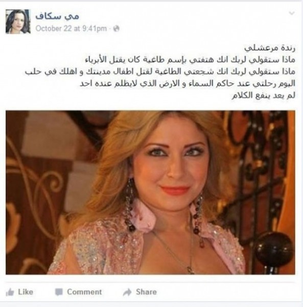 وجهت الفنانة السورية المعارضة مي سكاف رسالة قاسية عبر صفحتها الخاصة على موقع "فيس بوك"، للراحلة رندة مرعشلي. قالت فيها: " رندة مرعشلي.. ماذا ستقولي لربك انك هتفتي بإسم طاغية كان يقتل الأبرياء؟.. ماذا ستقولي لربك انك شجعتي الطاغية لقتل اطفال مدينتك واهلك في حلب؟.. اليوم رحلتي عند حاكم السماء والارض الذي لا يظلم عنده احد.. لم يعد ينفع الكلام".