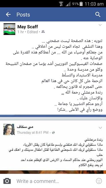 وأوضحت سكاف أن من يعرفها يدرك تماما أنها لا تتشفى بالموت، فهي ليست من الأوصياء عن الله في الأرض، على حد قولها، وقالت "إن كل من اتهمها ينتمي الى مدرسة الاستبداد والتسلط سواء من فريق النظام أو المعارضة"، مضيفة أن "الرحمة على كل كائن حي في هذا العالم، حتى المجرم له قانون يحاسبه".