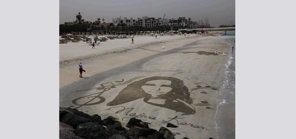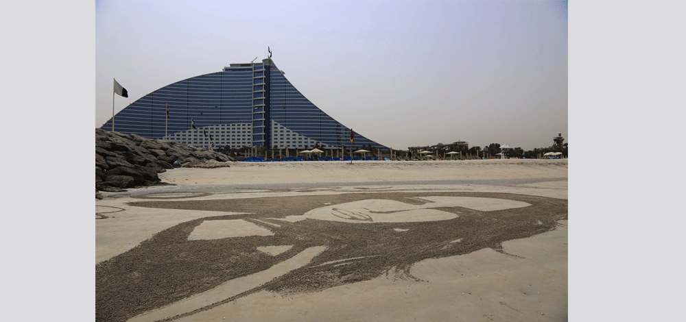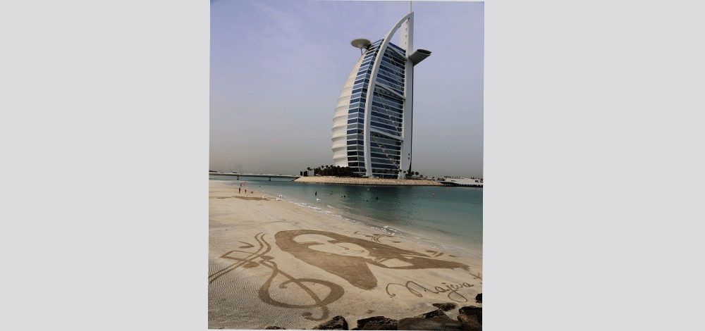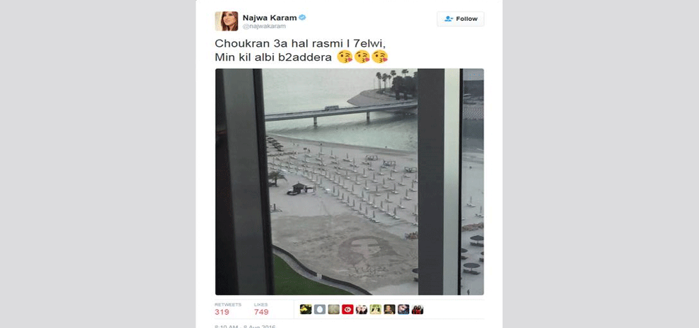 انتشرت مؤخراً على صفحات التواصل الاجتماعي صورة للوحة رسمت على رمال شاطئ "فندق شاطئ جميرا" في دبي، نشرتها الفنانة اللبنانية نجوى كرم، بعد أن أقامت في الفندق، وتفاجأت خلال نزولها عبر المصعد البانورامي بصورتها مرسومة على رمال الشاطئ وعلقت على صفحتها الخاصة على "تويتر" بسؤال طرحته على متابعيها، ما إذا لفتهم شيء معين في الصورة، وفي تعليق آخر تبعه بدقائق علقت مبدية إعجابها الشديد بالصورة كاتبة، "شكراً على الرسمة الحلوة من كل قلبي بقدرها".