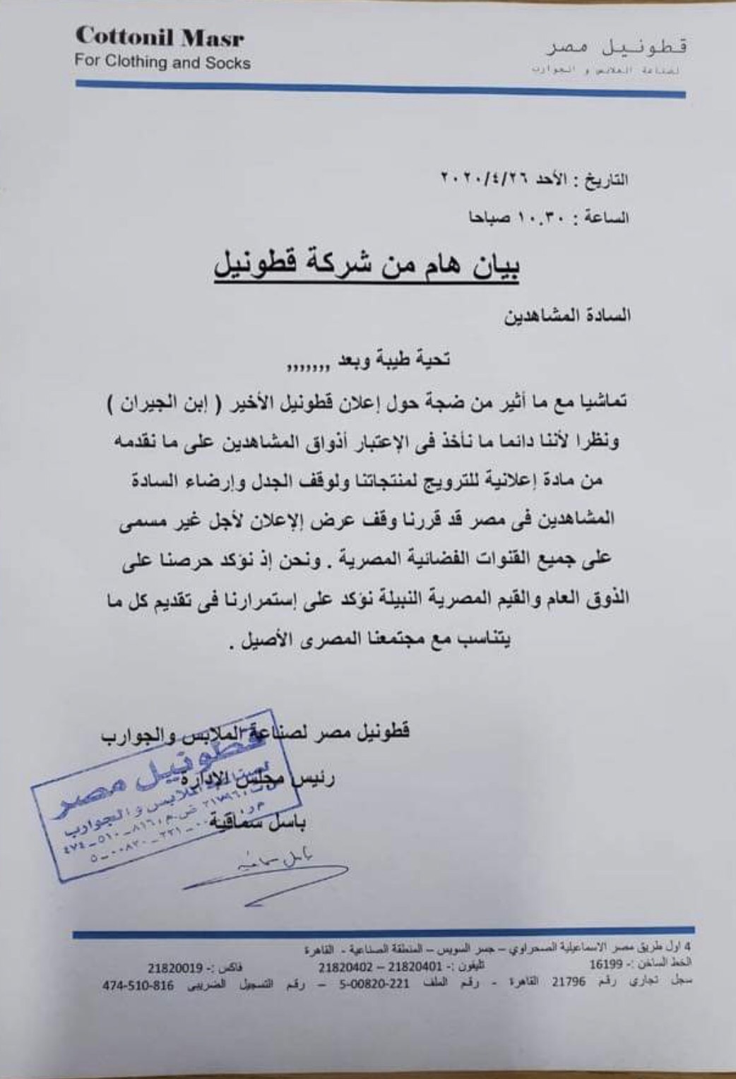 وأصدر مجلس إدارة مجموعة قطونيل، بيانا بعد الكشف عن توجيه مطالبات رسمية للبرلمان المصري بوقف الإعلان، ذكرت فيه: "تماشيًا مع ما أثير من ضجة حول إعلان قطونيل الأخير «ابن الجيران» ونظرًا لأننا دائمًا ما نأخذ في الاعتبار أذواق المشاهدين على ما نقدمه من مادة إعلانية للترويج لمنتجاتنا ولوقف الجدل وإرضاء السادة المشاهدين في مصر، قد قررنا وقف عرض الإعلان لأجل غير مسمى على جميع القنوات الفضائية».